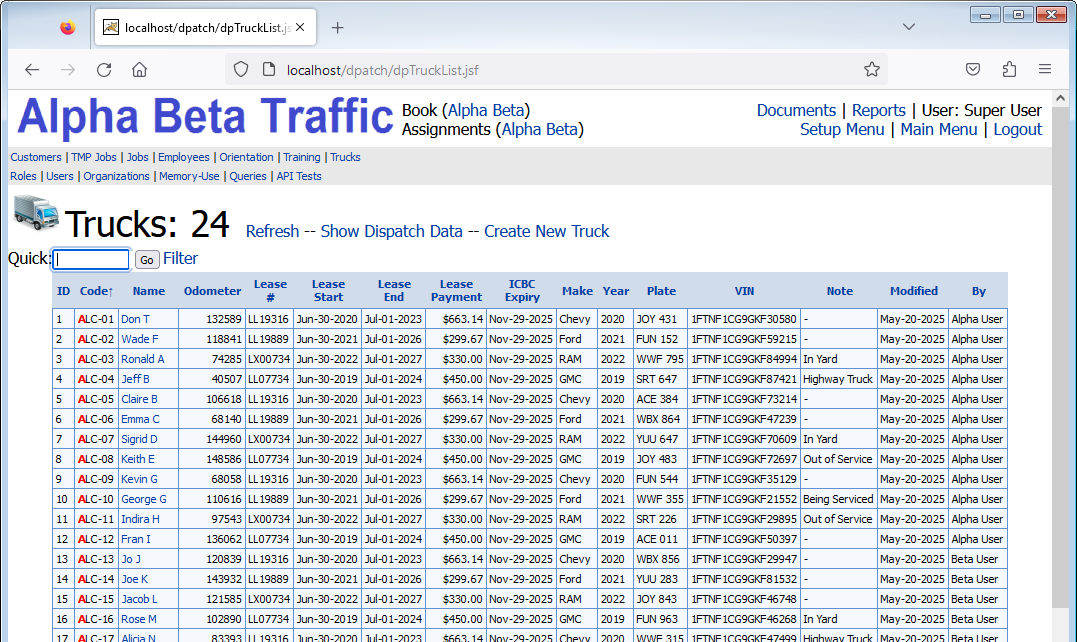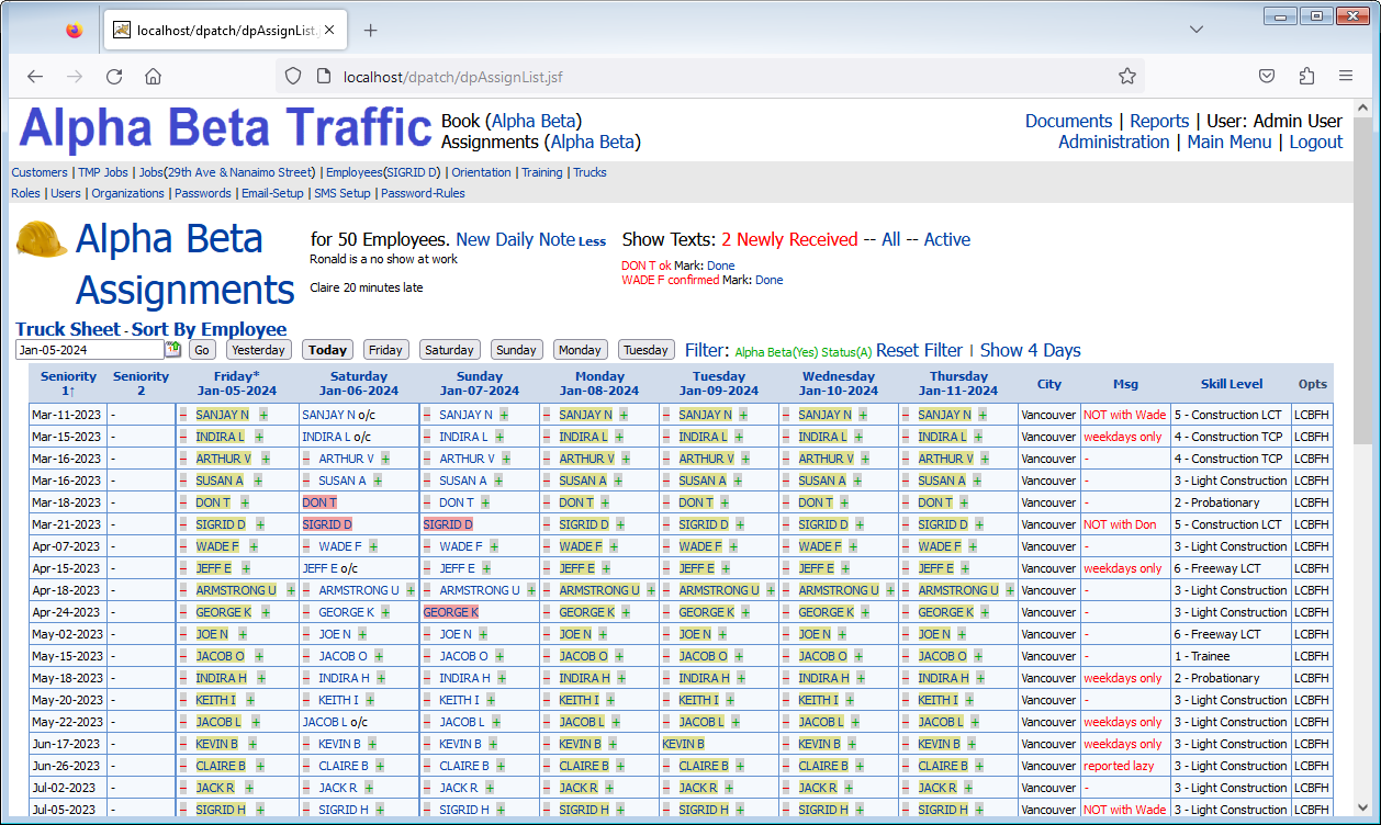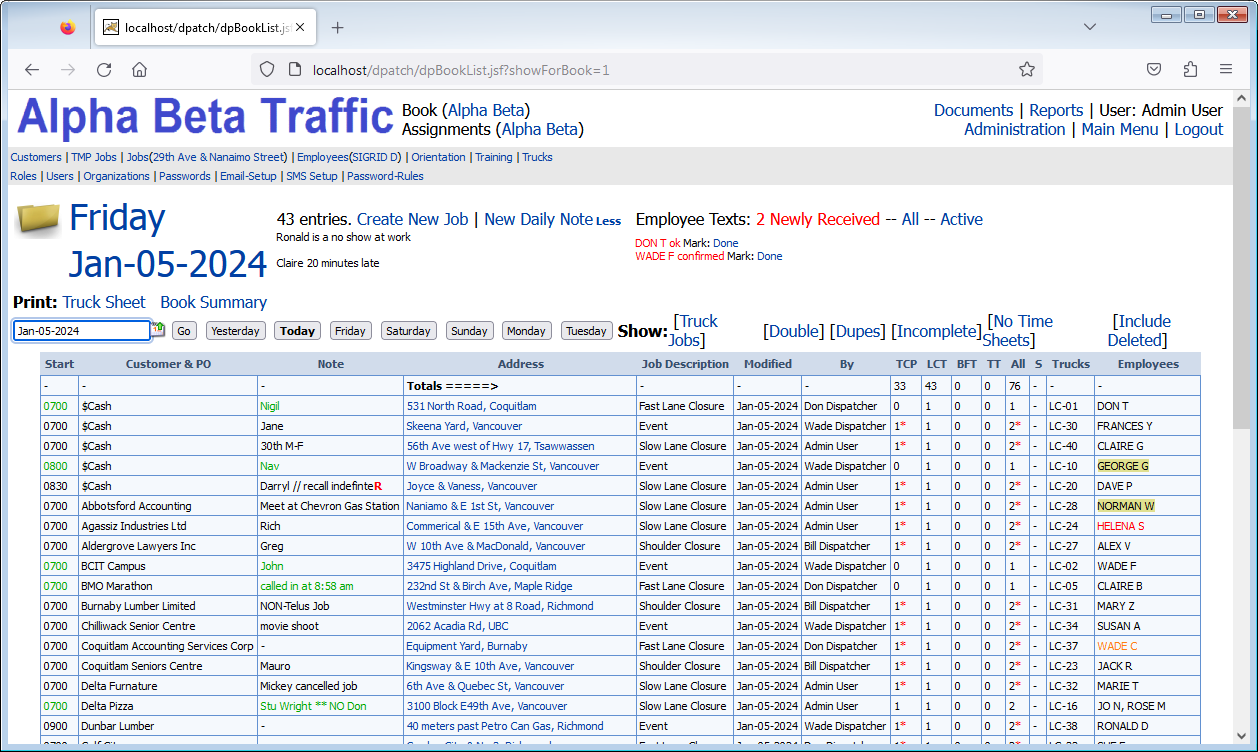 | The daily book page shows incoming text messages and the status of all job assignments. The weekly assignments page shows all employee assignments for a week. The job page shows all job-related assignments. Pages are heavily color-coded, quickly drawing attention to important details. |