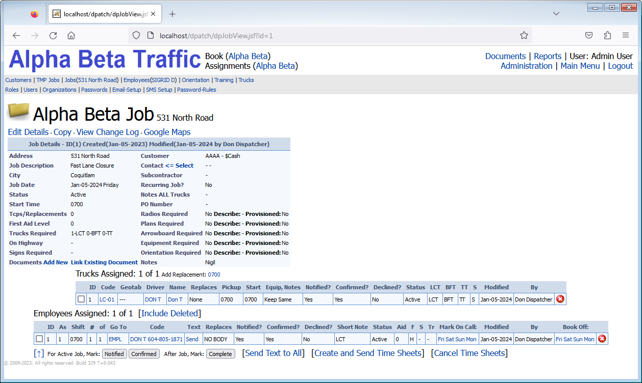 | Dispatchers text job details and site plan links to TCPs. TCPs confirm jobs. TCPs enter time spent. Site supervisors sign. |